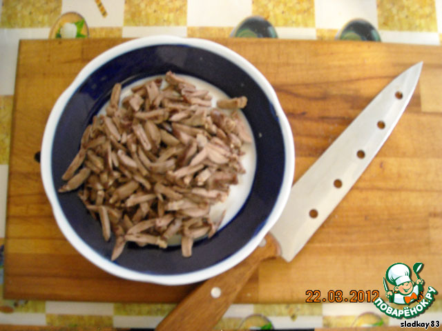 Вареные потроха откинуть на дуршлаг, дать стечь воде и нарезать тонкими полосками.
