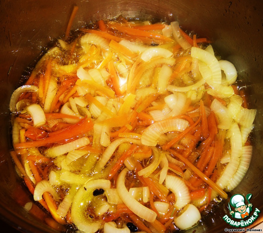 Первые шаги этого блюда похожи на приготовление плова. Рис промываем до тех пор, пока вода не станет прозрачной. Морковь нарезаем соломкой, а лук полукольцами. В глубокую кастрюлю с толстым дном наливаем оливковое масло слоем примерно 2 см и включаем на максимальный огонь. Как только от масла пойдёт белый дымок, закладываем морковь, лук и все специи, кроме шафрана. Обжариваем в течение пяти минут.