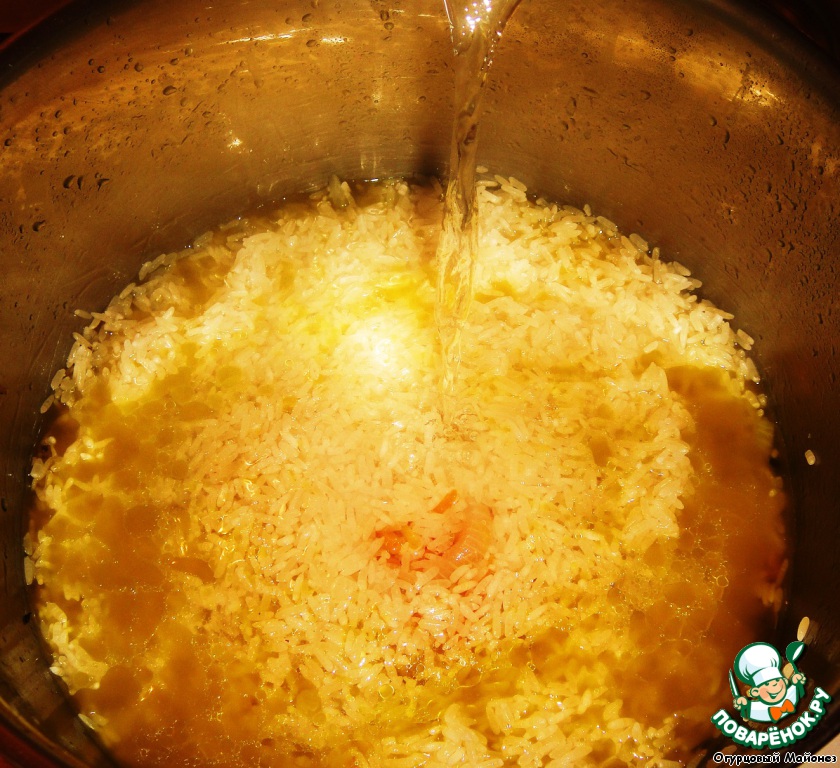 Сверху выкладываем рис, разравниваем его лопаточкой и заливаем кипящей водой так, чтобы она покрывала рис на 1 см. Уменьшаем огонь и оставляем томиться под крышкой.