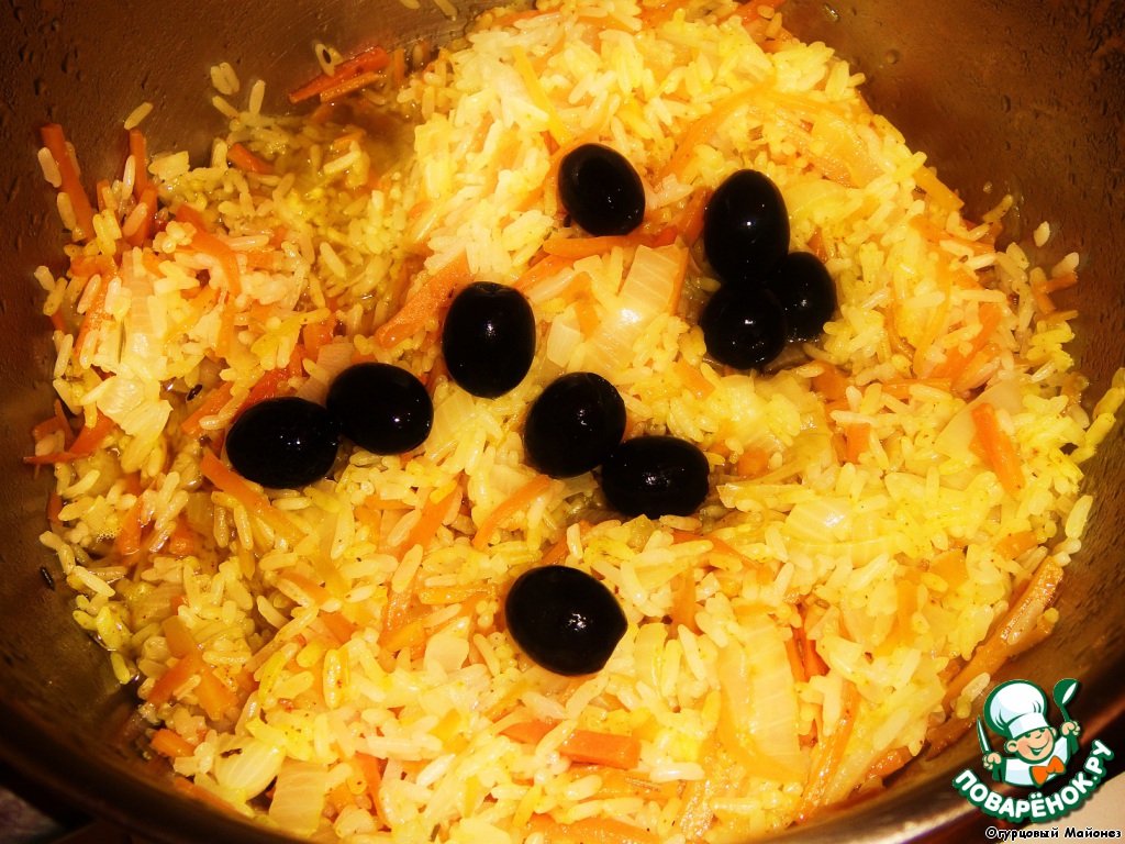 Добавляем в кастрюлю с рисом маслины, шафран и перемешиваем.