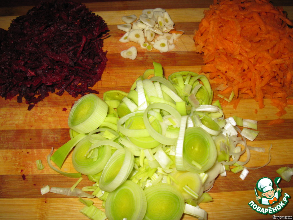 А пока займемся овощами. Морковь и свеклу я натерла на терке, лук нашинковала колечками, а чеснок - пластинками.