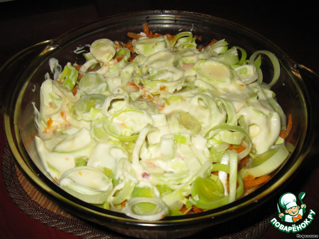 Теперь все это слегка смазала майонезом (конечно, максимально обезжиренным!) и продолжила выкладывать слои: рыба, морковь, лук.