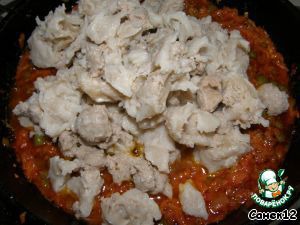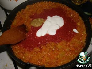Добавить томатную пасту, сметану, горчицу, соль, перец и специи