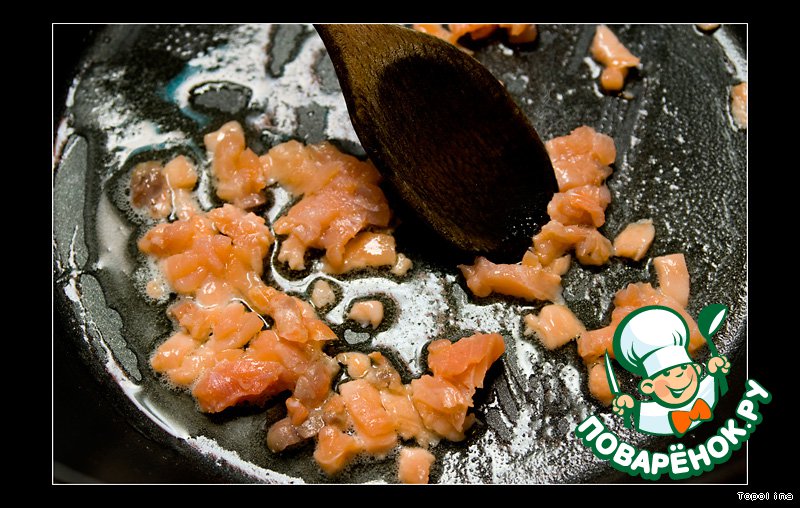 Рыбку порезать на кусочки и подрумянить в сливочном масле.
