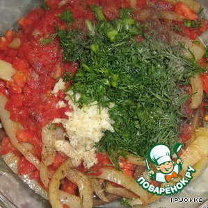 Соединить овощи, добавить измельченный чеснок и нарубленную зелень, посолить и поперчить. Перемешать.