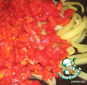 Помидоры ошпарить кипятком и очистить от кожицы. Нарезать кубиками, добавить к перцу и жарить 2 минуты.
