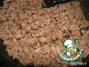 Потом добавляем в сковороду фарш и жарим на огне побольше, хорошенько помешивая.