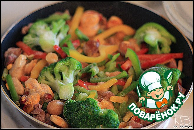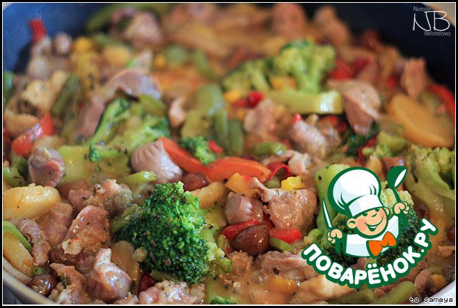 После того, как желудки немного обжарились, высыпаем в сковородку грибочки, перец, брокколи. Тушим это все дело под закрытой крышкой.