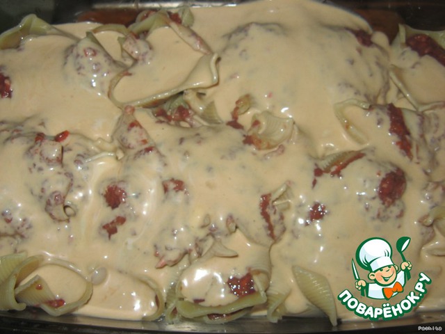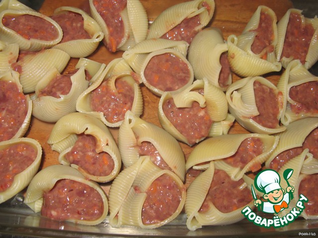 Нафаршировать их фаршем, сложить в смазанную маслом форму, залить соусом, посыпать тертым сыром.