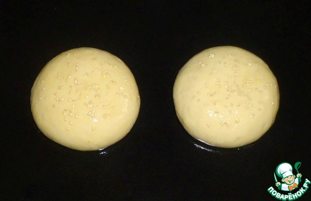 Затем заготовки булочек смазать яичным желтком, посыпать кунжутом и выпекать в духовке, разогретой до 180 градусов 25 минут.