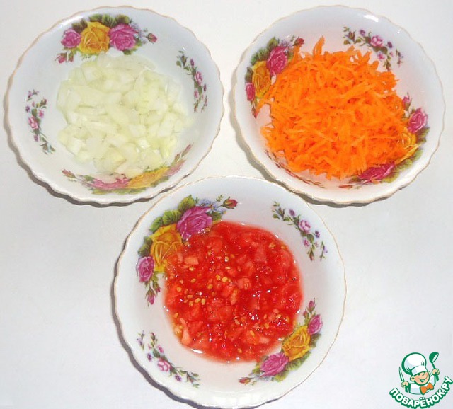 За это время приготовим плов. Сначала подготовим ингредиенты для плова. Морковь нужно натереть на средней тёрке, лук очистить и мелко нарезать, помидор обдать кипятком, снять кожицу и мякоть мелко нарезать.