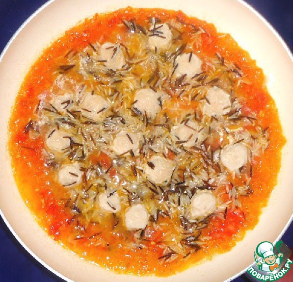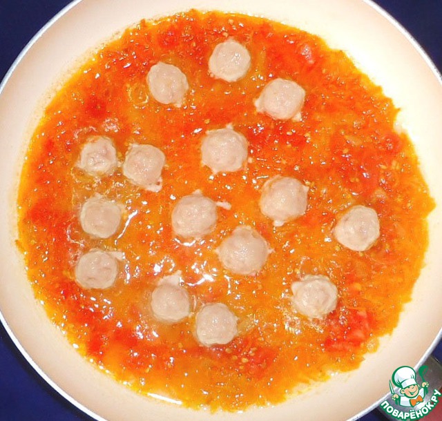 Добавить помидоры, куриные фрикадельки, воду и соль.