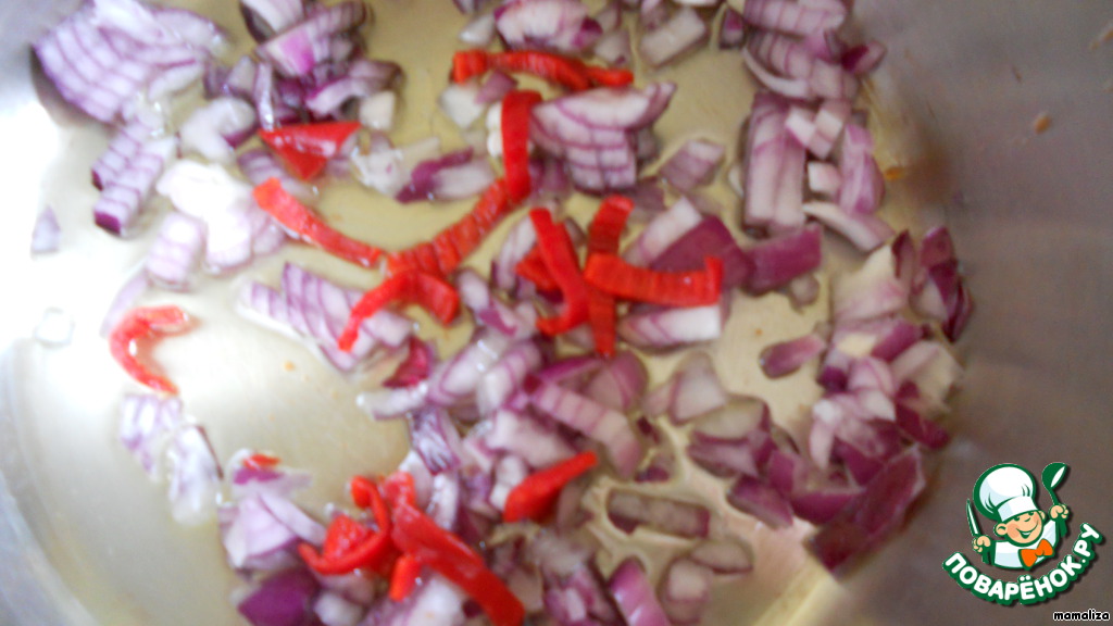 На дно толстостенной кастрюли или казанка налить масло, добавить мелко порезанный лук и острый перец.