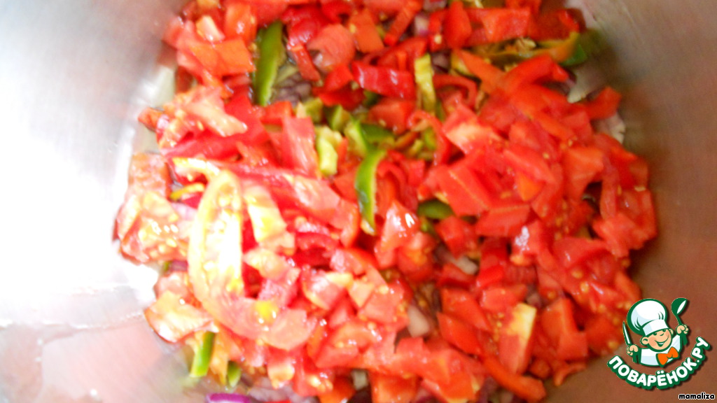 Мелко порезать лук, сладкий перец и помидоры, добавить в кастрюлю.