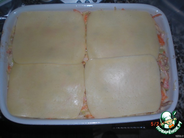 Духовку нагреть до 200 градусов, сверху на запеканку положить пластинки или тёртый сыр (около 100 грамм) и отправить в духовку минут на 30, пока сыр не расплавится и не припечётся.