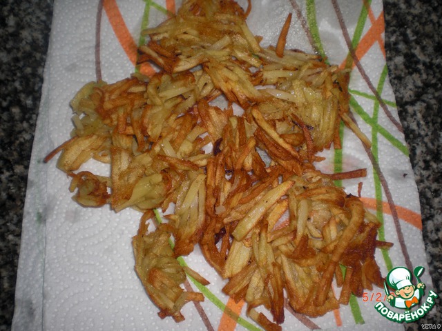 Обжарить картошку в большом количестве горячего растительного масла на большом огне до готовности и золотистого цвета.