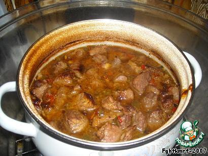 Если будете готовить в духовке, дам один совет. Залейте мясо жидкостями, поставьте на газ, дайте закипеть и снимите пену. Только потом добавляйте перчик и овощи. И уже тогда ставьте чугунок/котелок/кастрюлю в духовку.
