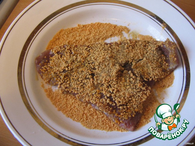 Через 30 мин (как вариант - прибежали с работы, муж срочно потребовал есть) отбивнушки просто панируем в чем душе захочется (сухари, мука, кунжут, зелень, паприка, овсяные хлопья, кукурузные хлопья.............. вариантов масса) и быстренько обжариваем на хорошо разогретом растительном масле до готовности (2-3 мин с каждой стороны).
