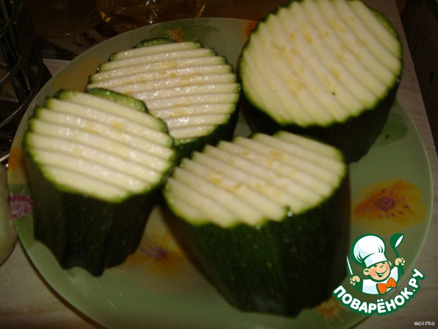 Разрезать каждый кабачок поперек на 2-3 части, чтобы получились "бочонки", длиной 5 см.