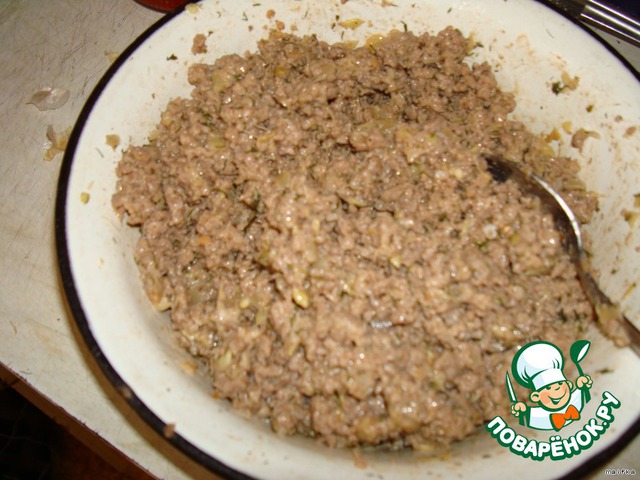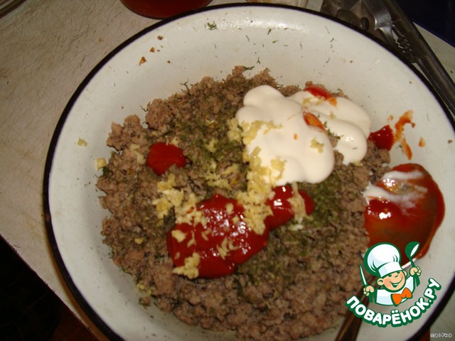 Соединить обжаренный фарш, лук с кабачками, зелень, кетчуп или томатную пасту, сметану, чеснок, соль, перец. Массу хорошо перемешать руками.