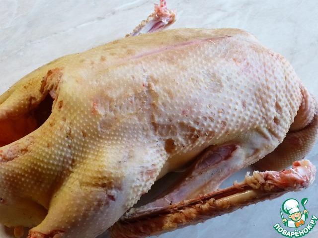 Внутрь гуся вкладываем несколько мандарин, при запекании они изнутри дадут приятные цитрусовые нотки. Гуся помещаем на глубокий противень, желательно с решеткой. Фольгой прикрываем кончики ног, крылья и полностью всего гуся. У меня большой гусь на 4 кг. Отправляем в духовой шкаф на 2 часа при 180 гарусов. По истечении данного времени, убираем всю фольгу, гуся переворачиваем на грудь, запекаем 30 минут при 180 градусов. По истечении времени переворачиваем гуся на спину и запекаем еще 30 минут при 180 градусах. Подавать гуся горячим из духовки с вашим любимым гарниром. Лично я к такому гусю посоветую тушеную капусту.