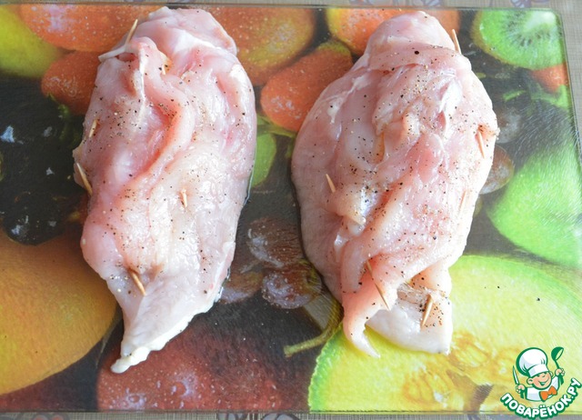 Солим и перчим грудки снаружи и изнутри. Кладем на одну половину куска на разрез по ломтику сыра, накрываем второй половиной и закалываем зубочистками.