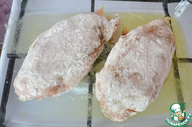 В сковороде (я сразу использовала форму для запекания) растапливаем сливочное масло (у меня деревенское) 1 ст. л. вместе с оливковым. Наши грудки обваляем в муке, стряхиваем лишнее и кладем мясо в горячее масло. Обжариваем на среднем огне по 2 минуты с каждой стороны, затем убираем в разогретую до 180-200 градусов в духовку на 10 мин.