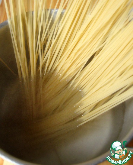 Спагетти слить, добавить соус из крабовых палочек. Хорошо перемешать.