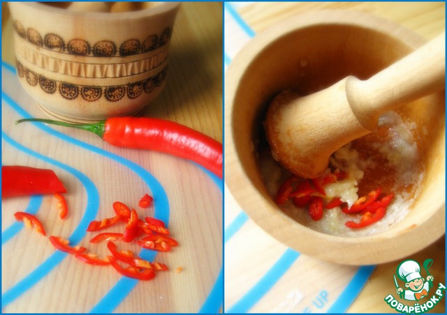 Жгучий перец очистить от семян и мелко нарезать. Добавить к чесноку и перетереть.