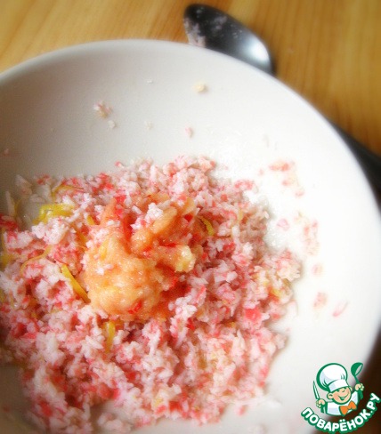 Соединить крабовые палочки с растертым чесноком с перцем. Перемешать.