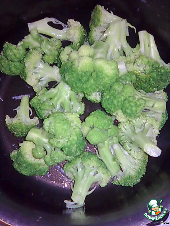 3. Брокколи разделить на соцветия и бланшировать в кипящей воде, буквально, пару минут, затем сразу же откинуть на дуршлаг и обдать холодной водой. Тогда они останутся зелеными и не потеряют вид и цвет.