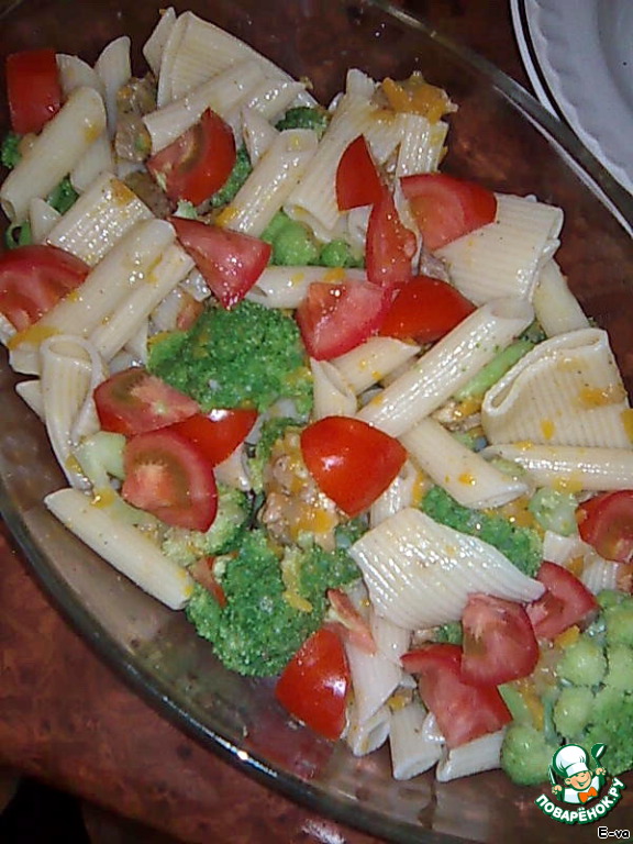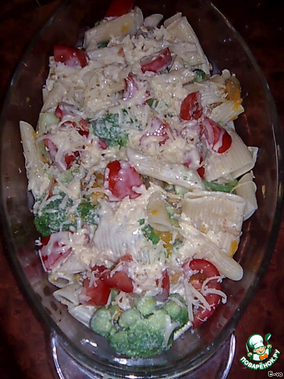 4. В большой чашке смешать вместе макароны, мясо, брокколи и помидоры.