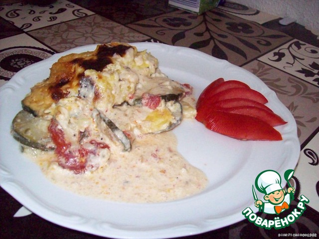В форму для запеканки выложить округлые окончания помидор,которые получаются,когда начнем резать помидоры,на них выложить обжаренные лук и чеснок.Поверх этих овощей выкладываем внахлёст слоями цуккини.потом помидоры и на верх картошку.Сверху овощи солим и перчим.У меня получилось в два ряда.