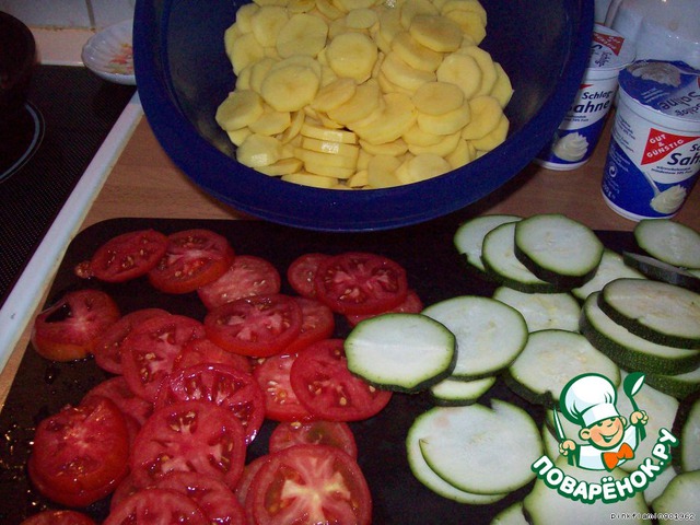 Картошку почистим,цуккини и помидоры помоем,все овощи порежем на кружочки толщиной 5 мм.Режем каждый овощ в отдельную чашку
