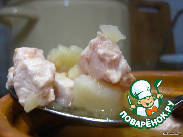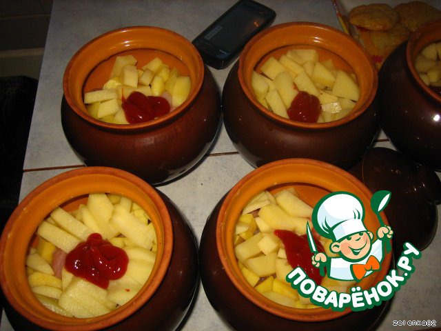 Кладем в горшочек слой картофеля, слой филе, слой картофеля, потом приправы (кетчуп, горчицу разведенную, горчицу в семенах, соль, перец, зиру, лаврушку и капельку соевого соуса в конце, потом все заливаем КИПЯТКОМ!!! и в ХОЛОДНУЮ духовку до готовности..