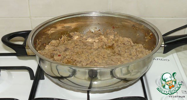 В большой сковороде (вок - это идеально!) разогреть кунжутное масло, соевый соус, положить в него измельченный перец чили, чеснок, кунжутное семя, через 30 секунд добавить туда фарш.