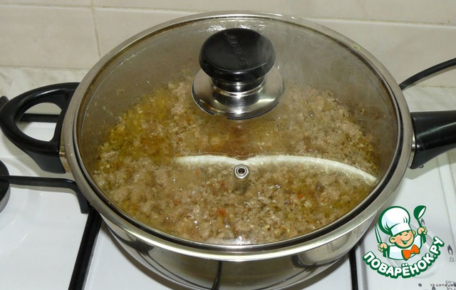 Обжаривать в течении 5 минут, а затем долить бульон. Готовить еще минут 10-15.