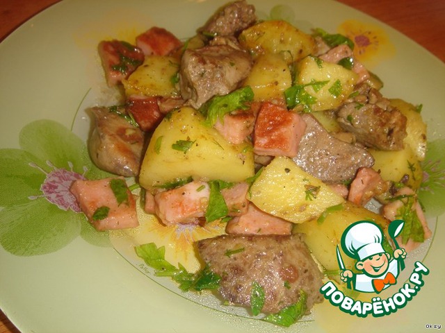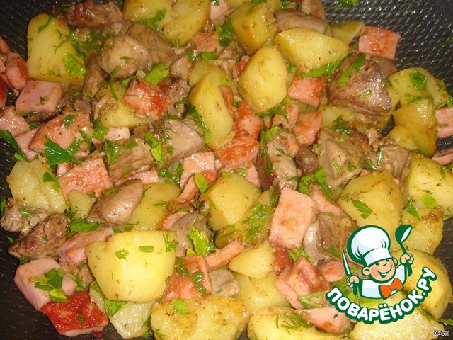 Добавьте к печени очищенную и порезанную крупными кубиками картошку и жарьте вместе 2-3 минуты.