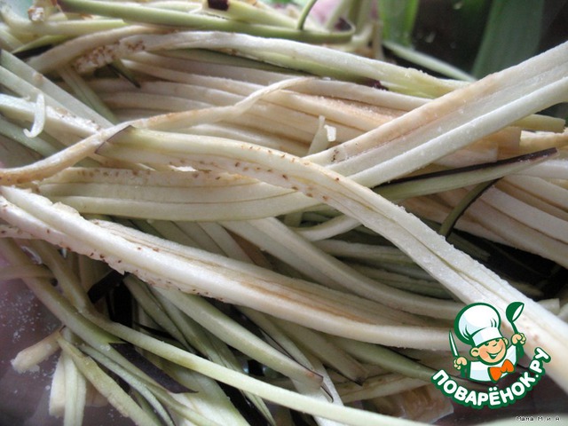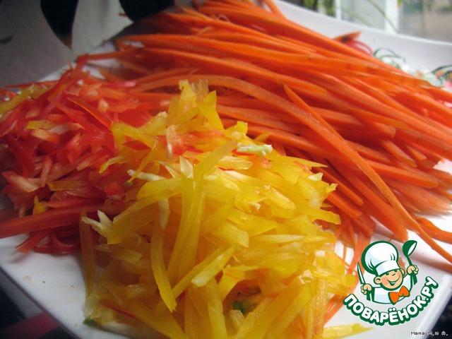 Овощи трем на терке для корейской моркови или какая у вас имеется, чтобы получилась длинная соломка.
