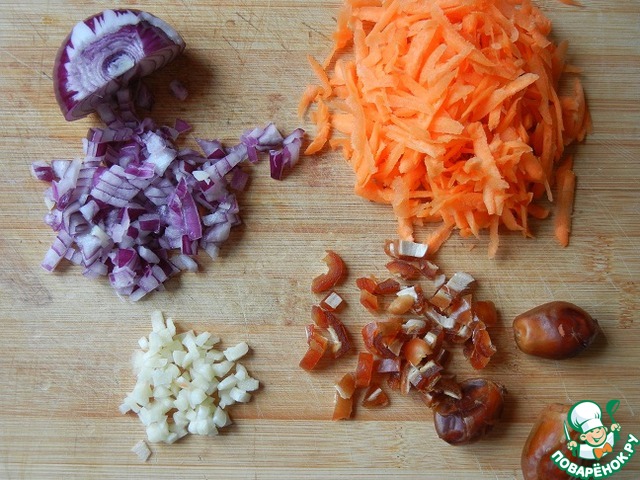 Лук, чеснок очищаем и мелко нарезаем. У фиников удаляем косточку и так же нарезаем. Морковь очищаем и натираем на крупной терке.