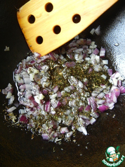 На сильном огне разогреваем сковороду, добавляем масло. Обжариваем лук и чеснок с добавлением сухого базилика. Жарим постоянно помешивая до мягкости, где-то 1-2 минуты