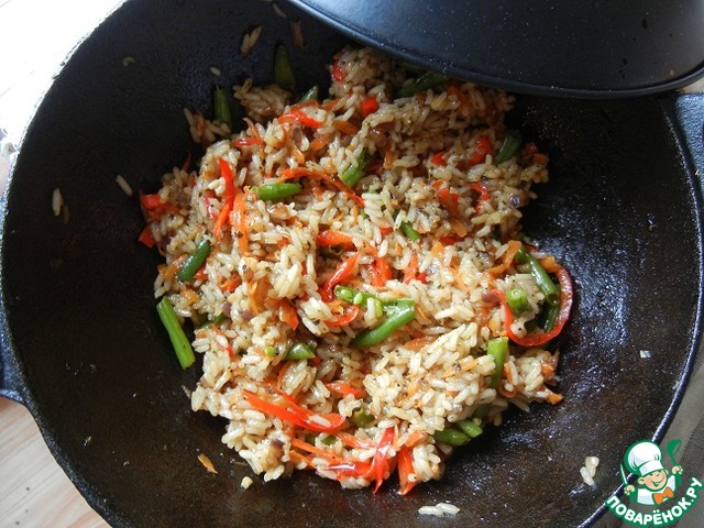 К обжаренным овощам добавляем рис, соевый соус и сахар. Перемешиваем и солим по вкусу. Уменьшаем огонь до среднего, накрываем крышкой и оставляем на несколько минут.