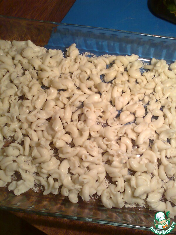 На противень (я чуть-чуть присыпала сухарями) выкладываем половину макарон.