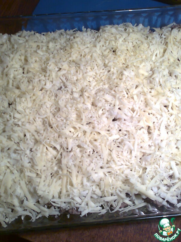 Потом оставшиеся макароны. Заливаем всё молочно-яичной смесью. Сверху посыпаем тёртым на крупной тёрке сыром и отправляем в духовку, разогретую до 200С, на 30мин.