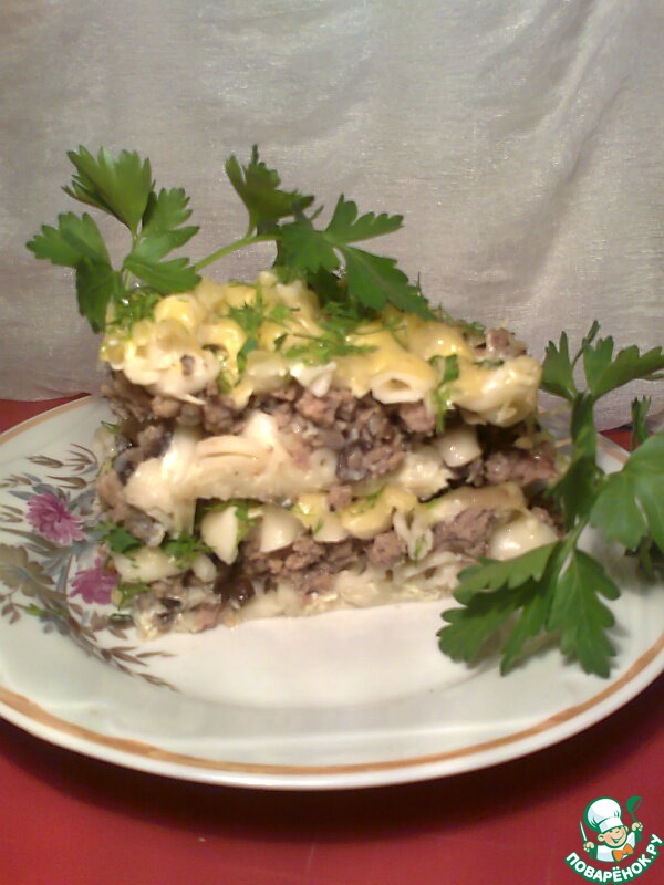 Запеканка из макарон с фаршем и грибами