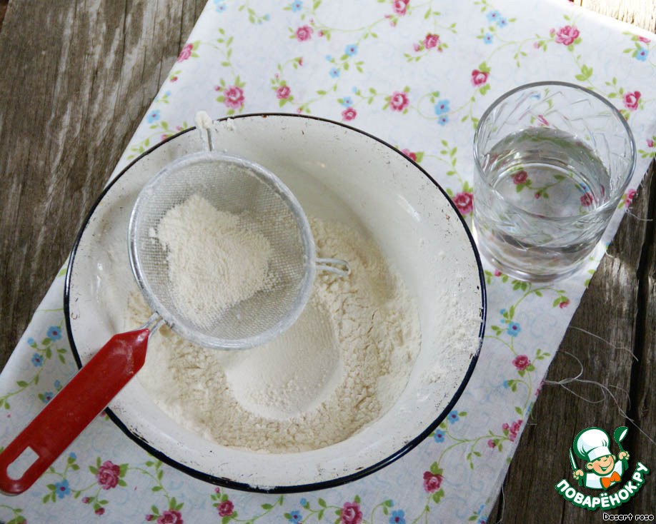 Приготовить тесто. Просеять муку, добавить щепотку соли. Влить стакан кипятка. Быстро замесить крутое тесто.