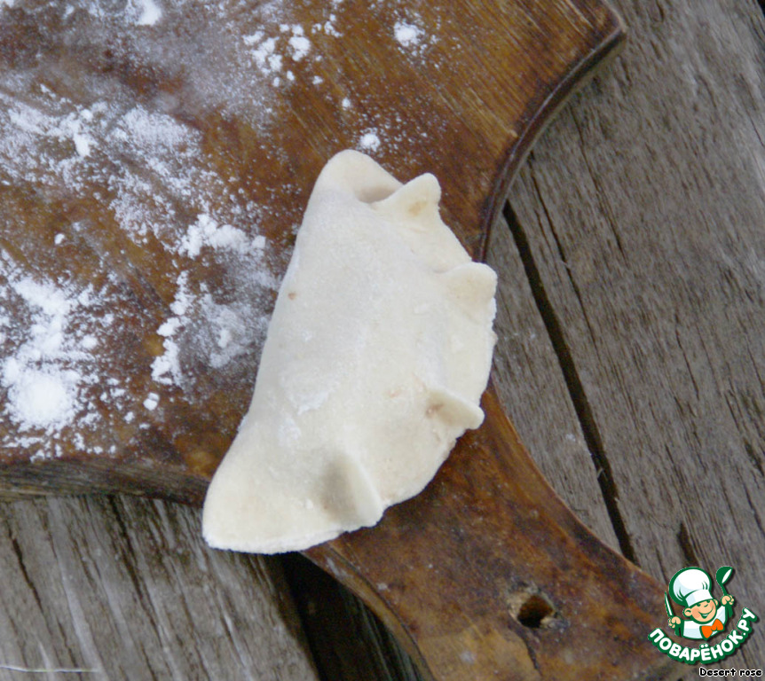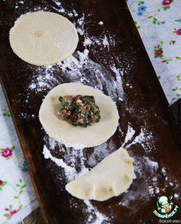 Тесто раскатать в тонкий пласт. Вырезать круги диаметром не менее 4 см. В середину уложить начинку и защипнуть полумесяцем.