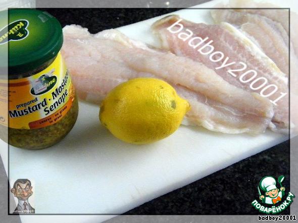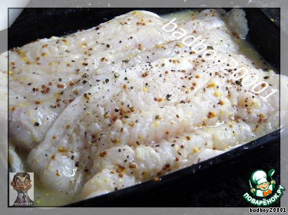 Дать несколько минут пропитаться, а пока замаринуем рыбу - смешаем горчицу, лимонный сок, соль и перец.