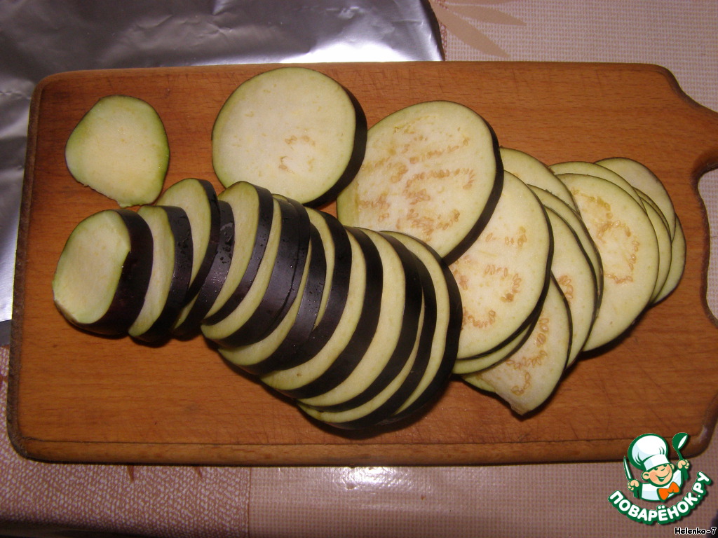 Баклажаны - тоже кружочками толщиной примерно 0,5 см
