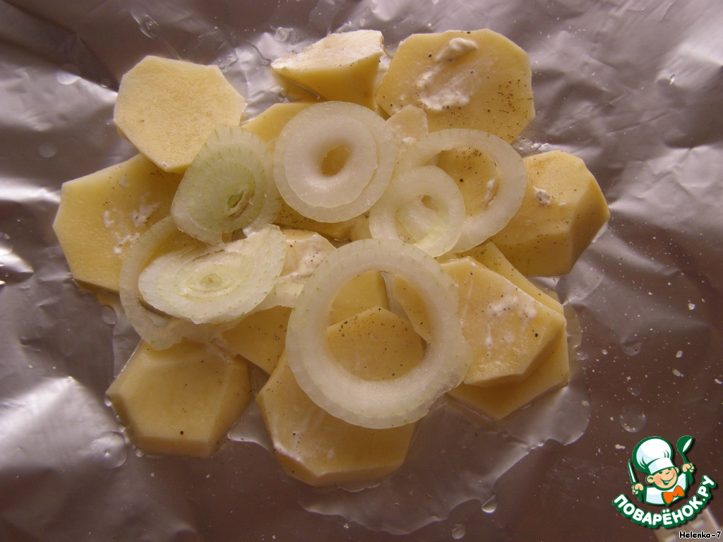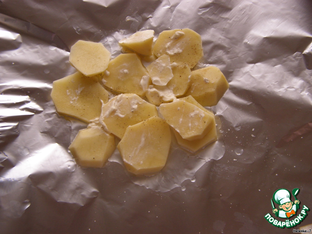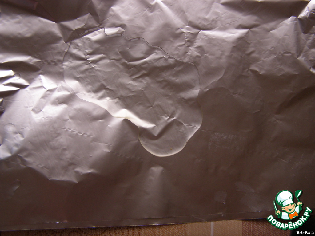 Фольгу раскладываем на столе и льем на неё немного растительного масла, чтобы картофель не прилип к ней